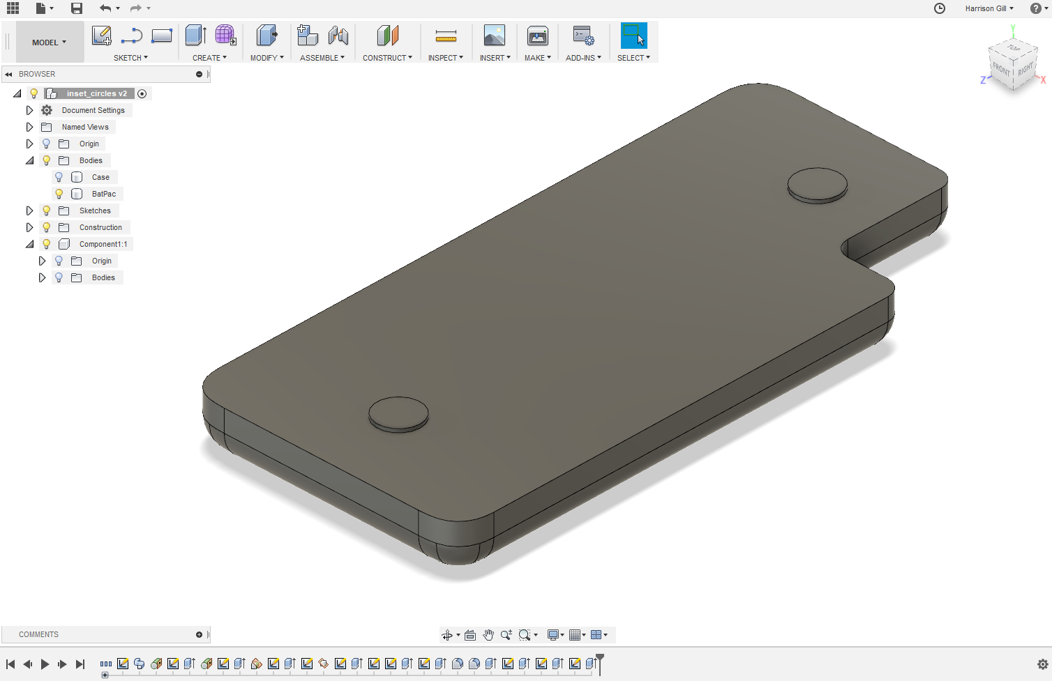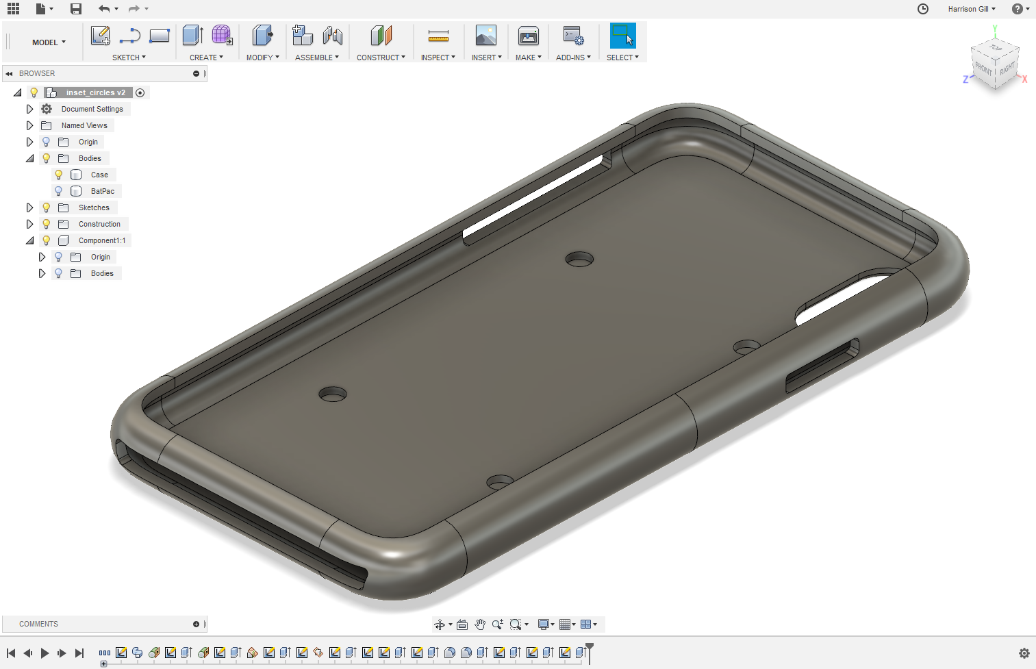 After brainstorming different ideas, the other mechanical engineer on the project and I each 3D printed different designs. I worked on this “Indent” idea, where magnets are in the phone case and battery pack, and circular indents are imprinted into the case. The battery pack has circular protrusions that match those of the case when they are together, so the battery pack won’t be affected by shear forces. What I learned from this prototype is that our current magnets are a little too small and too far apart, so the force holding the case to the battery pack is slightly too weak. We printed this case using TPU, which worked will for the phone case, but the battery pack should be printed on something a little less flexible. The width of the battery pack could also be increased without sacrificing the feel of the phone, which would help us fit in a bigger battery.